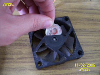 Luego de limpiar el exceso del lubricante, deberíamos echarle al eje unas gotitas del aceite de silicona; para que cuando empiece a funcionar de nuevo, el calor no afecte al ventilador. Por último sellamos con el mismo con el sticker que retiramos al inicio.